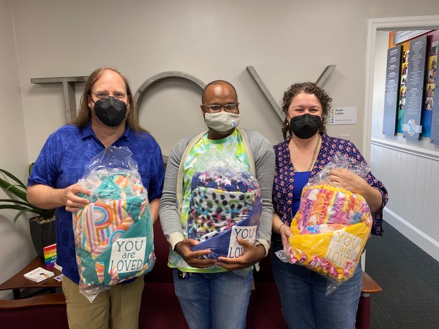 In the areas where the care kits were being assembled, tables were set up for two community service agencies. The first, Heart Math Tutoring, provides volunteer-based, one-on-one math tutoring to elementary school students during the school day. A representative delivered a brief Moment for Mission during both services and was available to speak with potential volunteers about the program. A second agency, Time Out Youth, provides a safe space for LGBTQ+ and straight allies to be themselves in an environment that respects the journey of all individuals. MSLC contributed to a program that helps members of the Time Out Youth community set up new homes for themselves as they transition to new living arrangements. MSLC provided kits to allow five youth to get on their feet at this crucial point in their lives. The church also provided tied fleece blankets to show that others care for them and are praying for them. Finally, a blood drive capped off the weekend with the presence of the Big Red Bus providing a mobile blood donation center from 9am-2pm.