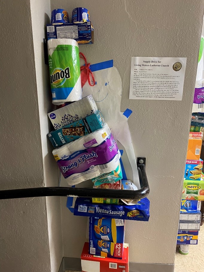A 2022 Kaelke Grant from the NC Synod allowed the children of St. Andrew’s Lutheran Church in Hickory to do their first mission trip in ages. The children hosted a supply drive for Living Waters Lutheran Church in Cherokee where they each were challenged to raise their height in food and supplies. A paper cut-out of each child served as a measuring stick for this challenge and a Thrivent Action grant helped them to reach their goals. Prior to their trip to Cherokee, children were asked to read books about Cherokee culture and history to share with the group.