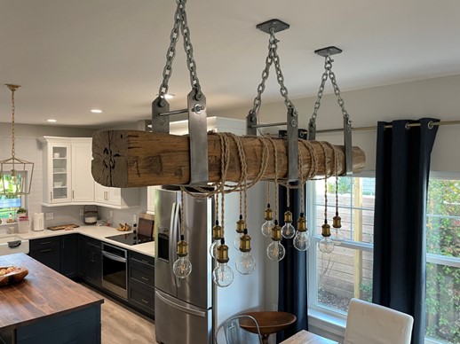 Troy Hoover’s beams have a more complicated history once they both got back to Georgia. Michael used one beam as a mantle in his Georgia home in 2014. When he moved he took it out and gave it to Jeff Nelson, his nephew. Jeff made it into a light fixture for his home in St. Augustine, Florida. Jeff has a love of taking things that have a storied past and creating beauty from them. Michael still has one beam and plans to use it as a display shelf in his home in Ellijay, Georgia.