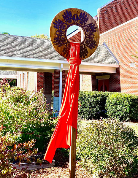 Members of Morning Star, Matthews, created a wooden sculpture draped in orange to display in their churchyard. “For a few weeks, the orange banner and wooden ring were left as mysteries—people were encouraged to spend a few minutes engaging the piece without outside guidance,” says Pastor John Mouritsen. “When we unveiled its purpose and meaning, people began looking more closely at the handprints carved into the wood—almost as if those shapes were now standing in for the nameless children from all over North America. Hanging an orange banner outside our Worship Center as part of the art installation is an invitation for all of us to learn more about a part of our society and history that is often swept aside.”